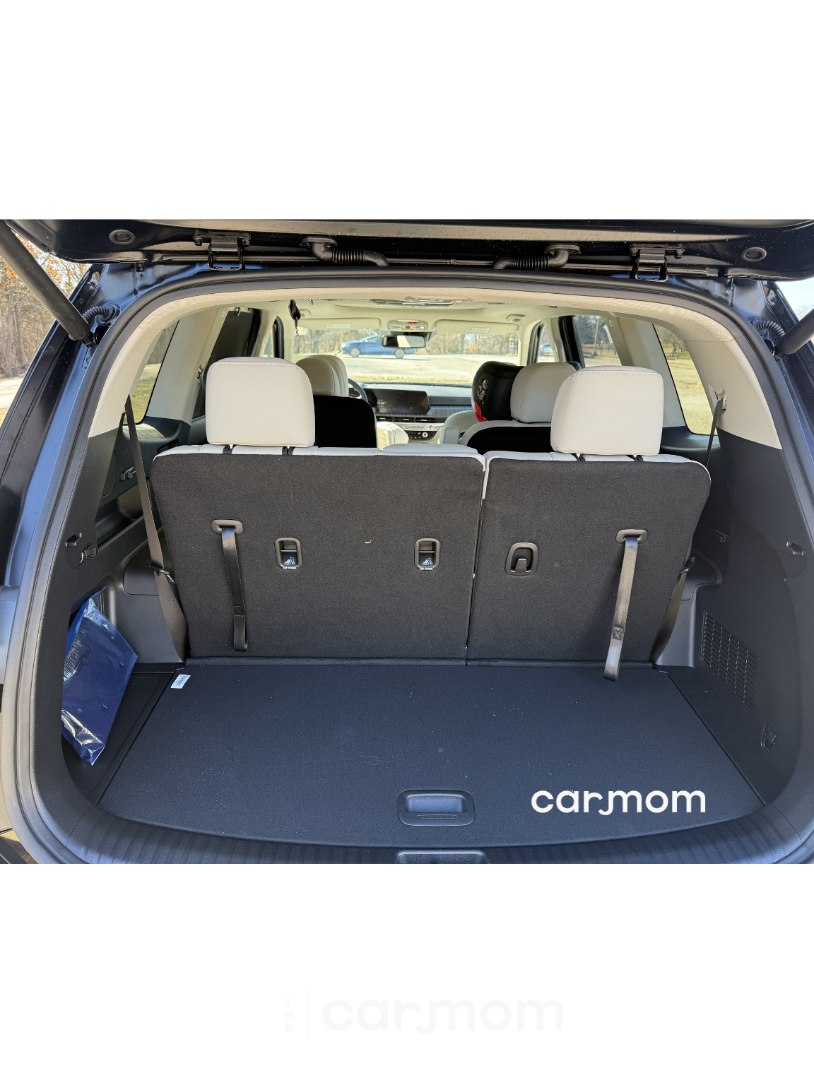 To get to the third row of this Kia Telluride you have a few options. Either you can shimmy in between the captain chairs if there aren’t rear facing car seats in the way or you can press one of two buttons on the second row seats—either at the top of the seat or on the bottom, which is great so older kids can get in and out of the car by themselves at grade school drop off. The Telluride has one of the roomiest third rows and I could sit all the way back here for a long road trip and be comfortable. But 3 people cannot fit back here. The middle seat is basically nonexistent. It is 5.5” wide, which doesn’t fit anything. Can’t fit a human, can’t fit a car seat, can’t fit a booster seat. But, this is not to harp on Kia. I still think this is a great family car but want you to know this is a 6 passenger car—just ignore the middle seat in the third row.